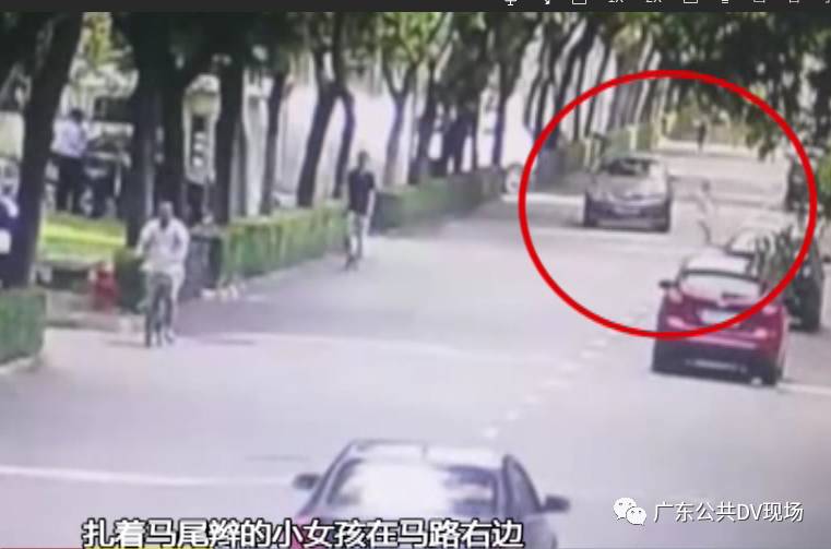監(jiān)控中顯示,街道上車來車往,一個穿裙子扎著“馬尾巴”的小女孩在通過馬路時,突然往前小跑,此時,一輛香檳色轎車正好駛過,結(jié)果車子直接撞倒了小孩,并將小孩卷入車底。