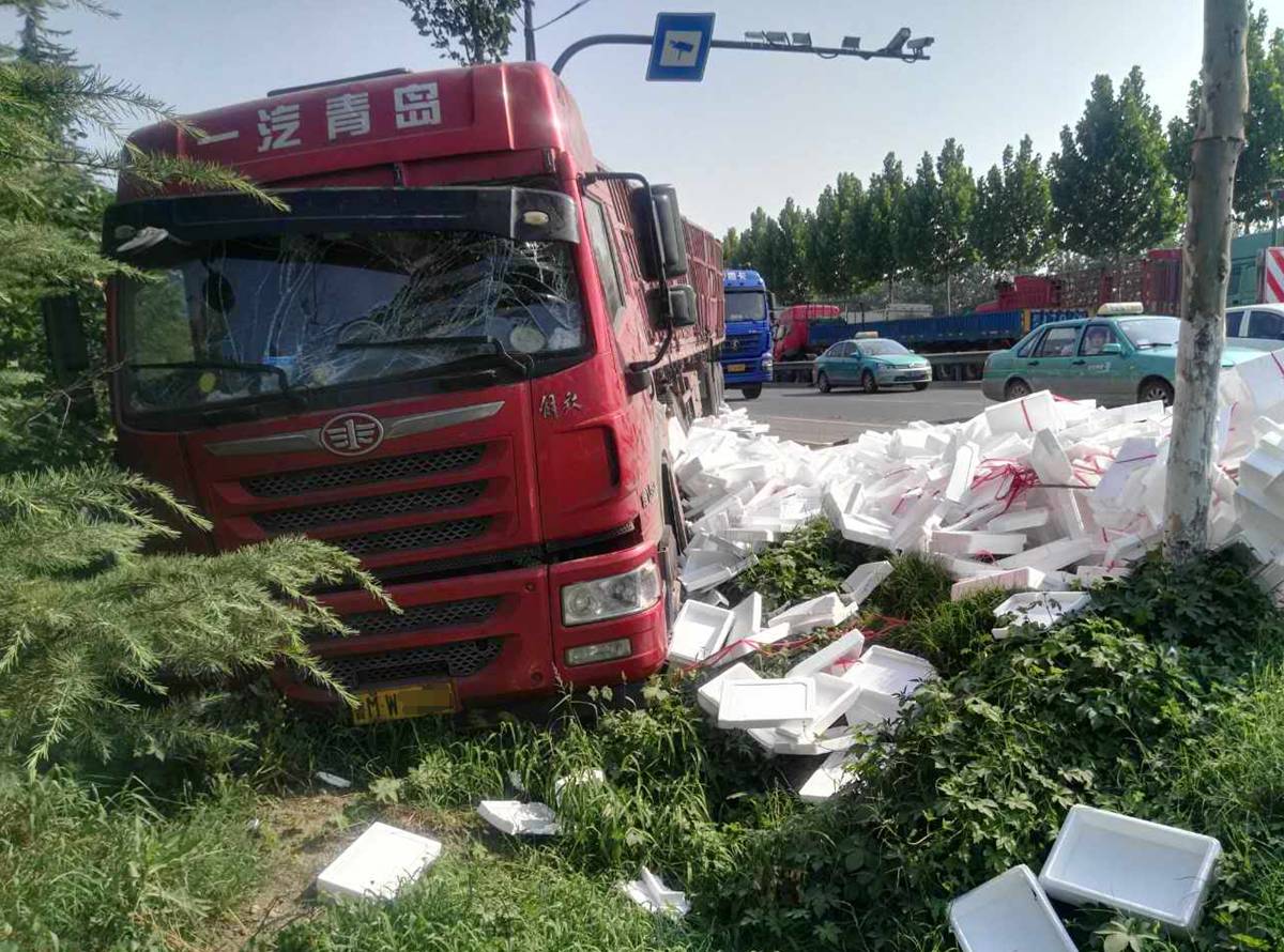 今天15:00許,在中潤大道和東外環(huán)交叉口往北200米處發(fā)生車禍,三輛貨車撞在一起,一輛貨車因為躲閃不急沖進溝里。