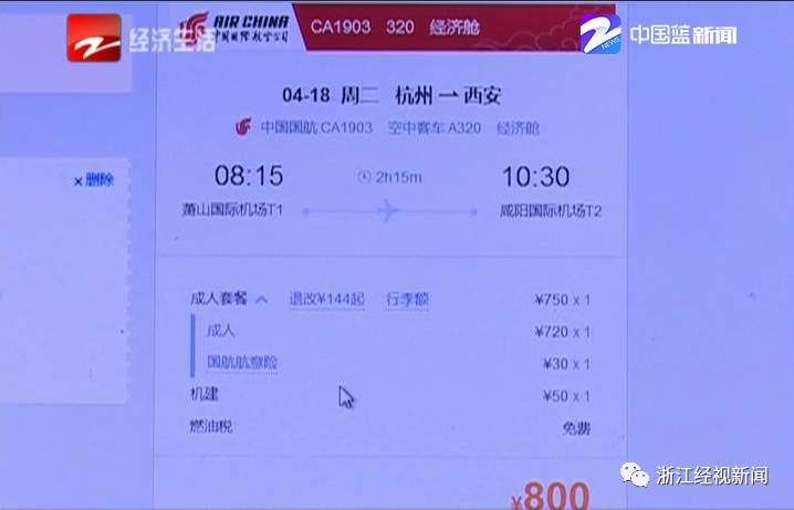記者嘗試購(gòu)買一張4月18日上午從杭州飛往西安,中國(guó)航空公司的經(jīng)濟(jì)艙機(jī)票。記者先查詢了中國(guó)航空公司的官網(wǎng),該機(jī)票價(jià)格為720元,另外需要附加50元的機(jī)場(chǎng)建設(shè)費(fèi),票價(jià)共計(jì)770元。除此之外,乘客可以自行選擇是否需要購(gòu)買一份20元的航空意外保險(xiǎn)。