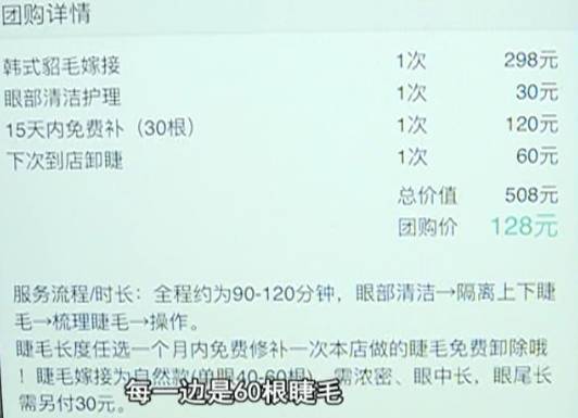 張女士:他家的小妹就跟我說,美團上每一邊是60根睫毛,兩邊加起來是120根,她每邊(店員)都給我多種了10根,按照上面寫的就要多補30元錢。