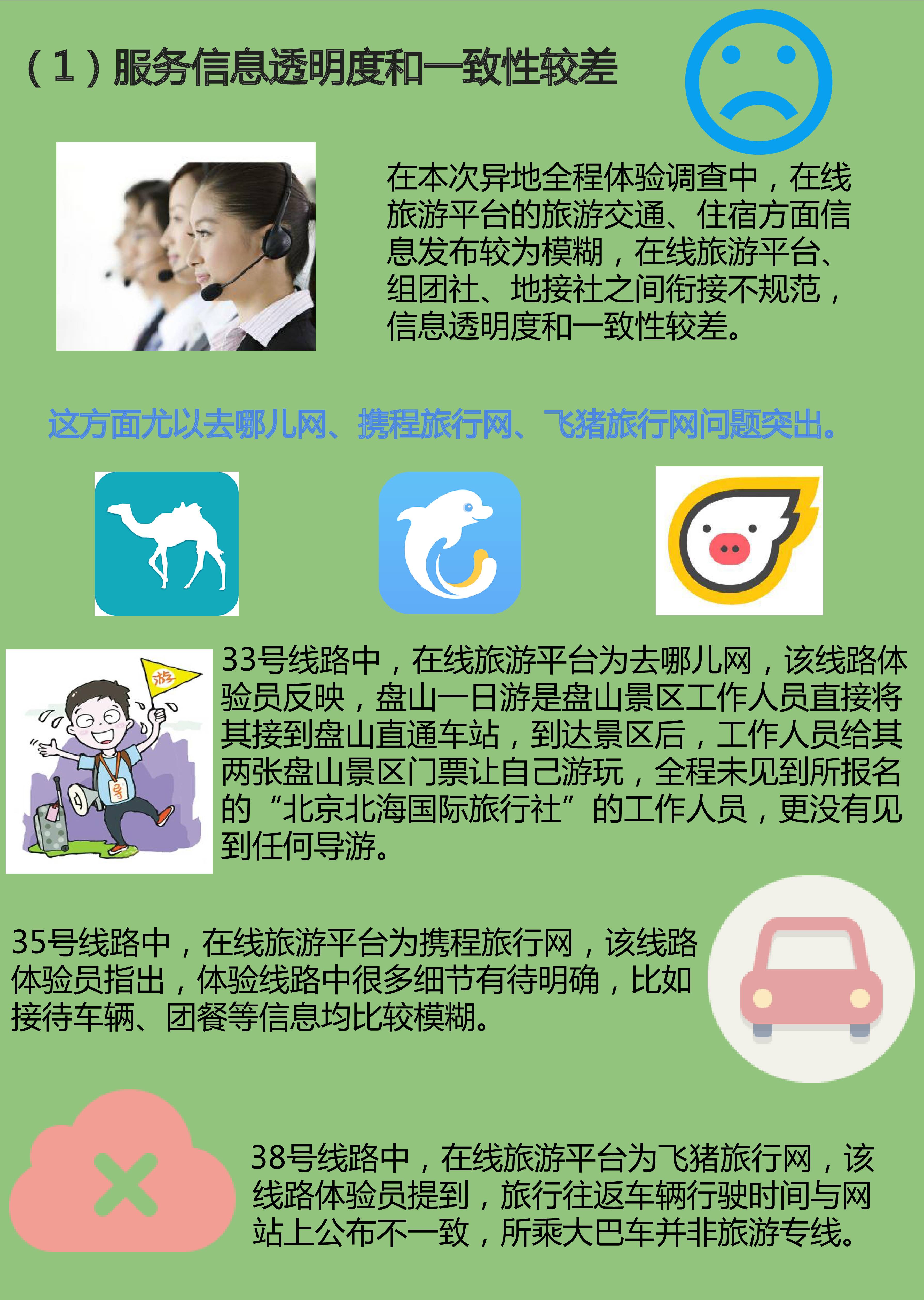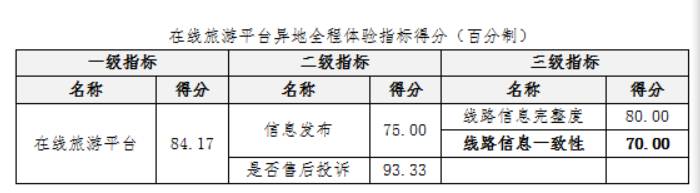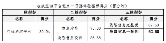 根據(jù)8家在線(xiàn)旅游平臺(tái)的體驗(yàn)結(jié)果,在線(xiàn)旅游平臺(tái)總體得分為80.94。其中,線(xiàn)路信息的一致性相對(duì)較差,即在線(xiàn)旅游平臺(tái)官網(wǎng)上顯示的信息與旅行社工作人員告知的信息一致性有差異。