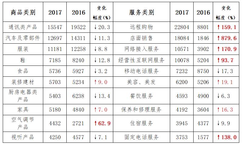 從服務(wù)類投訴來(lái)看,與2016年同期相比,銷售服務(wù)、互聯(lián)網(wǎng)服務(wù)投訴比重明顯上升。投訴量居前五位的是銷售服務(wù)、生活和社會(huì)服務(wù)類、互聯(lián)網(wǎng)服務(wù)、電信服務(wù)、文化、娛樂(lè)、體育服務(wù)。