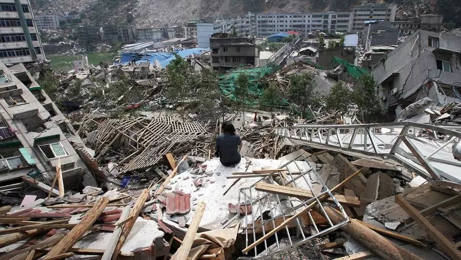 △ 2008年5月18日,北川,失去女兒的母親在廢墟瓦礫前痛哭。