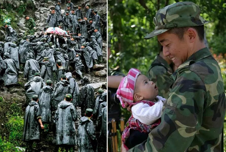 △ 左圖:汶川抗震救災(zāi),5月13日,官兵靠身體搭建人梯,轉(zhuǎn)運傷員。右圖:我想這應(yīng)該是世上最溫暖的笑容。