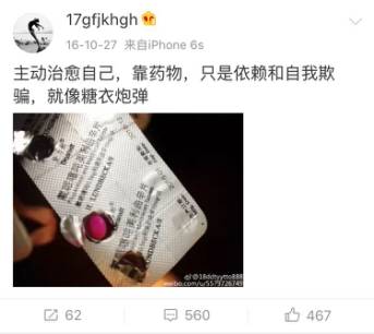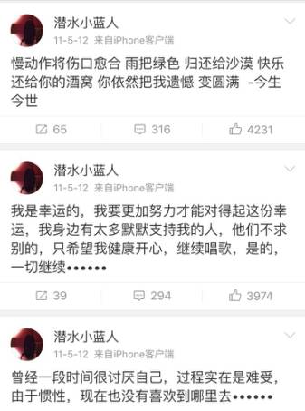 在這個(gè)賬號(hào)里,博主記錄了他的不自信,對(duì)家人的虧欠,以及心中的抑郁。這與他平日里微博大號(hào)上,分享音樂的畫風(fēng)迥然不同。