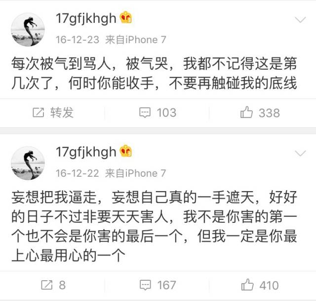 近日,疑似張馨予微博小號(hào)“17gfjkhgh”被扒,這個(gè)簡介為“負(fù)面情緒的私人垃圾桶”的微博賬號(hào)信息量巨大,發(fā)布的內(nèi)容稱被前任打壓。