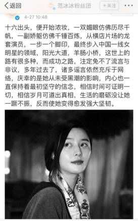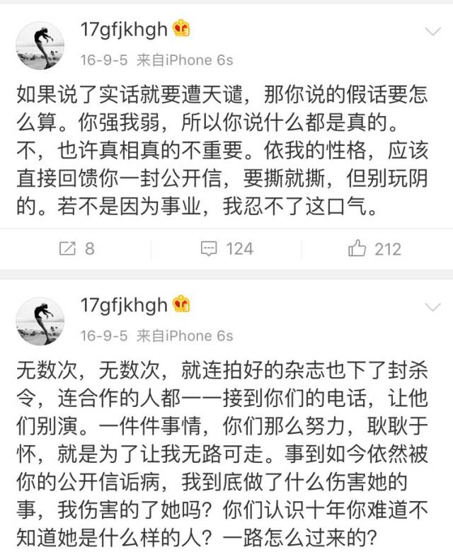 微博中指出,自己許多工作通告被迫取消,甚至“合作的人都一一接到你們的電話,讓他們別演了”。(這里的你們被指是在暗指范冰冰和李晨)