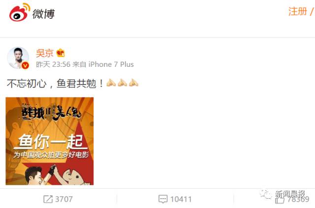 昨晚23:56,吳京也在新浪微博上曬出海報(bào)回應(yīng)網(wǎng)友: