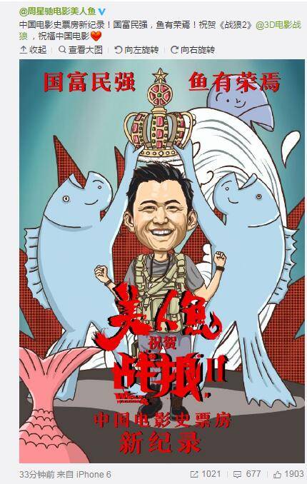 令人捧腹的是,周星馳電影美人魚官方微博的管理員在晚上九點(diǎn)半時(shí)就提前祝賀《戰(zhàn)狼2》的登頂,感覺他們的小編已經(jīng)按捺不住下班的心情了……