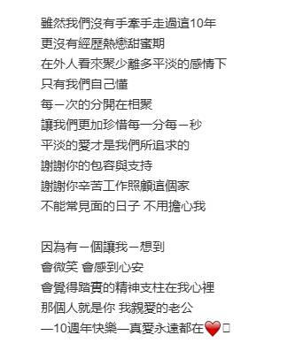 妻子Peggy此前也在微博秀出了婚禮一周年以及十年愛情長跑。8月11日是何潤東與妻子Peggy二人相識滿10周年紀(jì)念日。