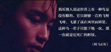 《阿飛正傳》是香港文藝片的代表。張國榮飾演的孤傲叛逆的浪子,是他的靈魂觀照,也是無數(shù)香港普通青年的縮影。對于整個香港人而言,《阿飛正傳》有著更為深遠的意義。那是有關(guān)香港人的歸屬感和漂泊感的一種精神歷程。關(guān)于無腳鳥,關(guān)于逃離,《阿飛正傳》也是迷惘中的我們自己。