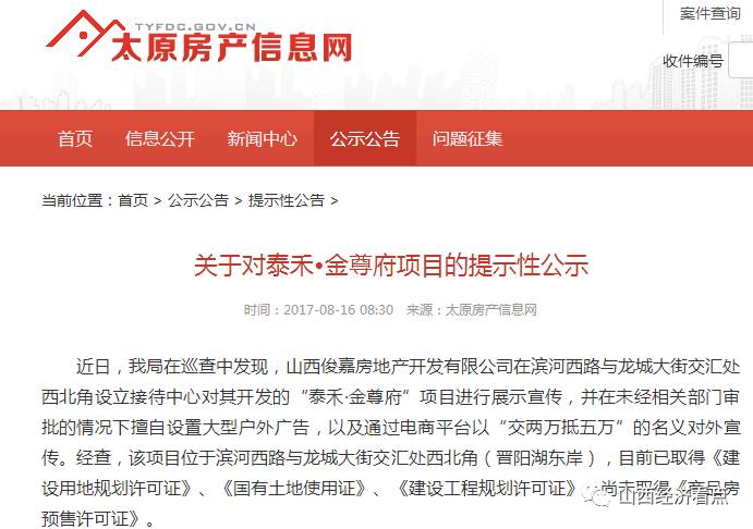 請廣大市民提高防范意識,切勿購買此類項目。也請市民及時關注太原市房地產信息網(wǎng),查詢、購買手續(xù)合法的樓盤項目,保護自身合法權益。