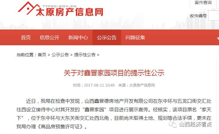此前該項目因土地、規(guī)劃、建設等手續(xù)均未完善停工多年,太原市房管局也對其違規(guī)銷售行為進行了查處。目前,該項目仍未取得合法手續(xù),又更名為“鑫晉家園”,并以保障性住房的名義對外進行宣傳,擅自購買存在極大的風險和隱患。