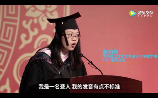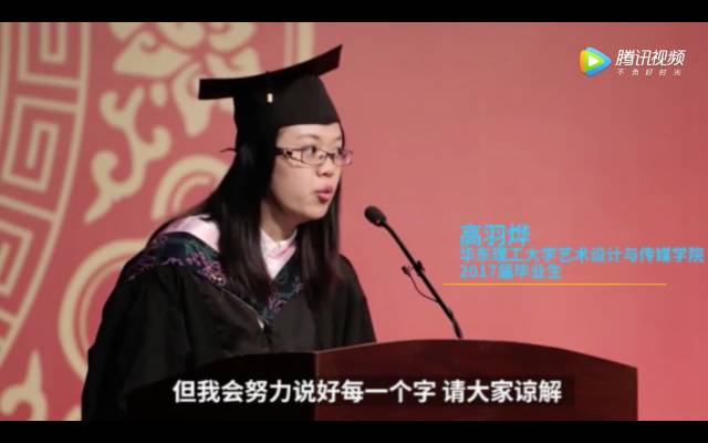 華東理工大學(xué)的2017屆畢業(yè)典禮現(xiàn)場,藝術(shù)設(shè)計與傳媒學(xué)院的高羽燁同學(xué)作為本科畢業(yè)生代表發(fā)言,雖然口齒不太清晰,她的發(fā)言卻獲得了全場持續(xù)最長久的掌聲,而她的故事更是讓很多人感動得潸然淚下……