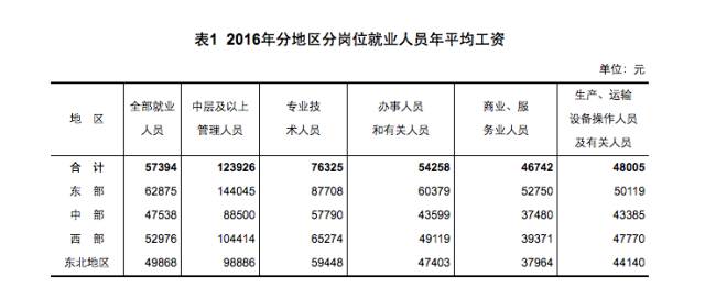 國(guó)家統(tǒng)計(jì)局對(duì)16個(gè)行業(yè)門(mén)類(lèi)的約96萬(wàn)家企業(yè)法人單位調(diào)查顯示,2016年,全部一套表平臺(tái)被調(diào)查單位就業(yè)人員年平均工資為57394元,比2015年增長(zhǎng)7.0%。